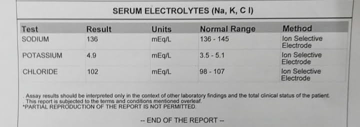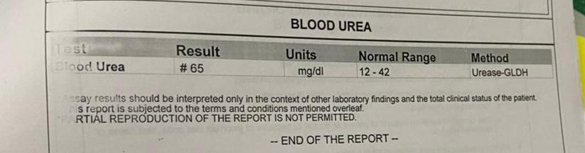 Blood urea: 15/6/21 - 65 mg/dl16/6/21 - 62 mg/dl18/6/21 - 76 mg/dl21/6/21 - 81mg/dl Serum creatinine: 15/6/21 - 3.4 mg/dl16/6/21 - 3.4 mg/dl18/6/21 - 3.2 mg/dl21/6/21 - 3.1 mg/dl Total leukocytes count: 16/6/21 - 2470018/6/21 - 2650021/6/21 - 31700 Serum Electrolytes: 15/6/21 - Na: 139 ; K: 5.2 ; Cl: 10616/6/21 - Na: 138 ; K: 5.1 ; Cl: 10518/6/21 - Na: 136 ; K: 4.9 ; Cl: 10221/6/21 - Na: 134 ; K: 5.5 ; Cl: 98 Diagnosis: Acute kidney injury secondary to urosepsis with hyperkalemia ( resolved)With anenmia of chronic disease Treatment: 15/06/21: Treatment: